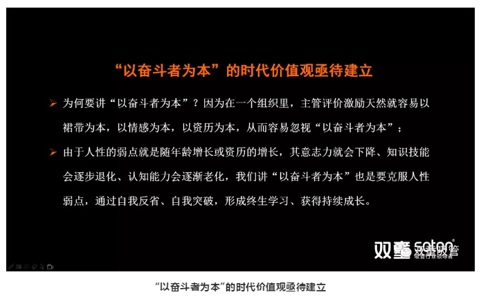 為什么要以“奮斗者為本”?由于人性的弱點(diǎn)就是隨年齡增長(cháng)或資歷的增長(cháng),其意志力就會(huì )下降、知識技能會(huì )逐步退化、認知能力會(huì )逐漸老化,我們講“以?shī)^斗者為本”也是要克服人性弱點(diǎn),通過(guò)自我反省、自我突破,形成終生學(xué)習、獲得持續成長(cháng)!