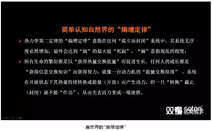 “熵增定律”意指在任何“孤立而封閉”系統中,其系統無(wú)序度必然增加,最終會(huì )達到“熵”的最大值“死寂”。任何一個(gè)人,任何一個(gè)組織,乃至于任何一個(gè)家庭,如果你把自己封閉起來(lái),你的內部一定是從有序到無(wú)序。如果你繼續封閉,它的混亂程度一定會(huì )達到最大值,一直到死寂。