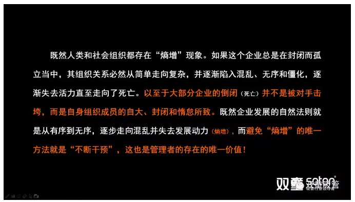 而避免“熵增”的唯一方法就是持續開(kāi)放和組織干預,從而打破平衡,持續加壓、刺激個(gè)體和組織喚醒“危機反饋機制”,這也是管理者的存在的唯一價(jià)值!