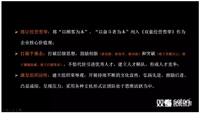 這樣一種邏輯其本質(zhì)是建立對員工和組織共同創(chuàng )造的基礎之上,離開(kāi)了創(chuàng )造和彼此奉獻,所謂的人性關(guān)愛(ài)是得不到基礎支撐的,企業(yè)必然會(huì )走向衰弱、死亡!“雙童”業(yè)已形成的“家”就不復存在!作為理性的認知,“雙童”本質(zhì)上是所有員工的創(chuàng )業(yè)平臺,而不是休閑和養老的地方。所以,樓仲平非常理性的引導員工認知:“‘雙童’不是你的家、沒(méi)有‘動(dòng)力’請回家!”
