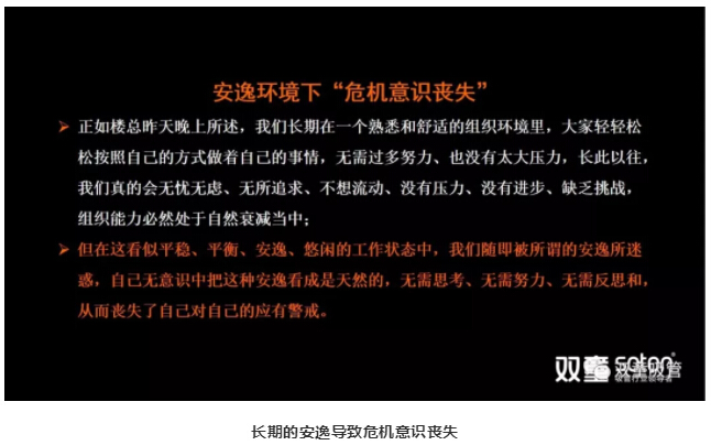 由于社會(huì )環(huán)境的復雜性、時(shí)代的巨變性和企業(yè)的自然墮變性,當家人樓仲平意識到“雙童” 直面“生死劫”!隨即通過(guò)“向死而生”的命題假設,讓團隊認知到雙童離“死亡”只有六個(gè)月,以此激發(fā)員工的危機感,從而讓“雙童”管理層再次脫離“舒適區”,遠離“危險區”,進(jìn)入“恐慌區”!通過(guò)對“死”的反悟,激發(fā)組織活力,從而得以延續獲得“生”的能力。