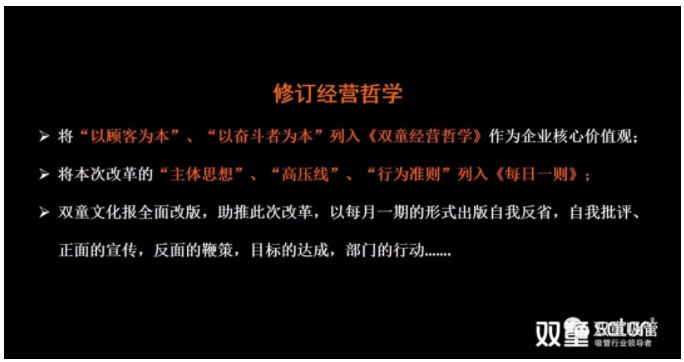將“以顧客為本”、“以?shī)^斗者為本”、“管理者以一線(xiàn)員工為本”列入《雙童經(jīng)營(yíng)哲學(xué)》作為企業(yè)核心價(jià)值觀(guān); 將本次改革的“主體思想”、“高壓線(xiàn)”、“行為準則”列入《每日一則》; 雙童文化報全面改版,助推此次改革,以每月一期的形式出版自我反省,自我批評、正面的宣傳,反面的鞭策,目標的達成,部門(mén)的行動(dòng)…….