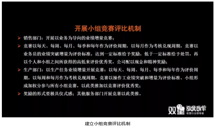 銷(xiāo)售部門(mén):以業(yè)務(wù)為導向的業(yè)績(jì)增量競賽;競賽以每天、每周、每月、每季和每年作為評價(jià)周期,以每月作為考核兌現周期,競賽以業(yè)務(wù)員的業(yè)績(jì)突破增量為評價(jià)標準,達到一定標準給予獎勵,低于一定標準給予處罰,再以個(gè)人和小組之間所獲得的高低來(lái)評價(jià)優(yōu)秀獎,公司配以現金和精神獎勵; 生產(chǎn)部門(mén):以生產(chǎn)任務(wù)業(yè)績(jì)增量開(kāi)展競賽;以每天、每周、每月、每季和每年作為評價(jià)周期,以每周和每月作為考核兌現周期,競賽以操作工業(yè)績(jì)突破和增量為評價(jià)標準、小組形成加權分參與所有小組競賽,以此類(lèi)推加以競賽評價(jià)優(yōu)秀獎;獎勵的形式要極具儀式感;其他服務(wù)部門(mén)開(kāi)展競賽以此類(lèi)推。