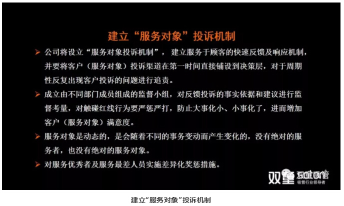 公司將設立“服務(wù)對象投訴機制”, 建立服務(wù)于顧客的快速反饋及響應機制,并要將客戶(hù)(服務(wù)對象)投訴渠道在第一時(shí)間直接鋪設到?jīng)Q策層,對于周期性反復出現客戶(hù)投訴的問(wèn)題進(jìn)行追責。 成立由不同部門(mén)成員組成的監督小組,對反饋投訴的事實(shí)依據和建議進(jìn)行監督考量,對觸碰紅線(xiàn)行為要嚴懲嚴打,防止大事化小、小事化了,進(jìn)而增加客戶(hù)(服務(wù)對象)滿(mǎn)意度。 服務(wù)對象是動(dòng)態(tài)的,是會(huì )隨著(zhù)不同的事務(wù)變動(dòng)而產(chǎn)生變化的,沒(méi)有絕對的服務(wù)者,也沒(méi)有絕對的服務(wù)對象。對服務(wù)優(yōu)秀者及服務(wù)最差人員實(shí)施差異化獎懲措施。