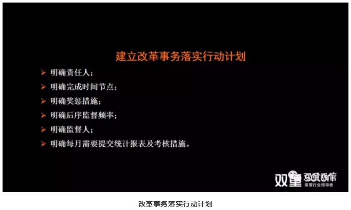 “雙童”將建立起改革事務(wù)落實(shí)行動(dòng)計劃,明確各項指標,并定立相應的考核措施,要求所有人每月將報表上交財務(wù),直接與工資掛鉤,確保每個(gè)人都行動(dòng)起來(lái),確保改革事務(wù)貫徹落實(shí)。