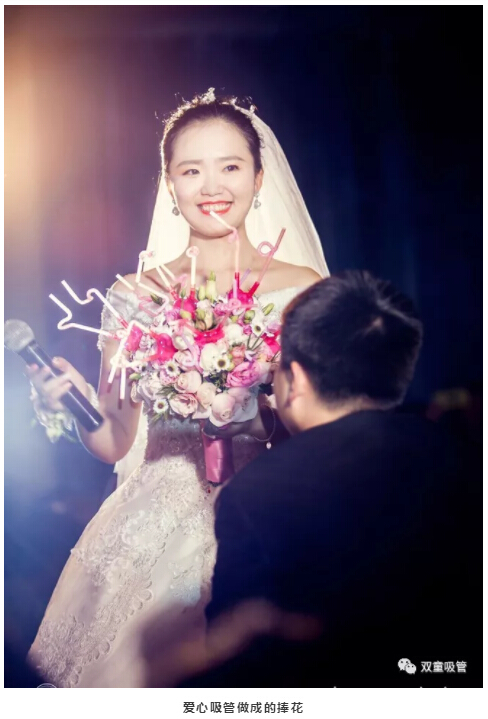 婚禮現場(chǎng)也是滿(mǎn)滿(mǎn)的“雙童”元素。婚禮現場(chǎng)的亭子就代表著(zhù)“雙童吸管”,吸管妞手里的捧花,也是由一根根愛(ài)心吸管組成的,洋溢著(zhù)滿(mǎn)滿(mǎn)的愛(ài)意!