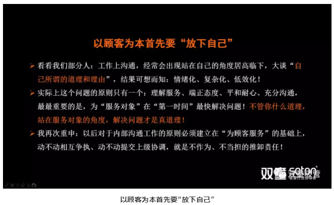 所以,管理者們不要把自己當成高高在上的領(lǐng)導,而是把自己當成一線(xiàn)員工的服務(wù)者,管理者。唯有建立“為下屬服務(wù)、為對象服務(wù)、引導團隊共同成長(cháng)”的意識才能真正實(shí)現為顧客服務(wù)。以顧客為本首先要“放下自己,為“服務(wù)對象”在“第一時(shí)間”最快為員工解決問(wèn)題!