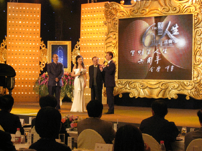 上圖為慶典晚會(huì )現場(chǎng),金庸大俠(圖右二)在接受主持人葉蓉(圖左二)、康輝(圖右)的采訪(fǎng),金庸大俠的精彩演講為晚會(huì )增添無(wú)窮樂(lè )趣。