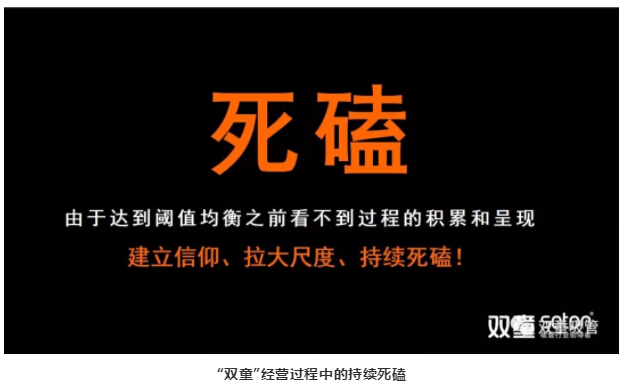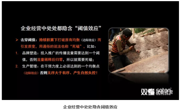 首先,引導大家理解企業(yè)經(jīng)營(yíng)當中處處都隱含著(zhù)閾值效應,而閾值擊穿,就是持續積累下打破原有均衡(邊際效應)而引發(fā)質(zhì)變,用通俗的說(shuō)法也稱(chēng)“死磕”。