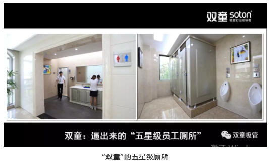 受此影響,2003年“雙童”在建設廠(chǎng)房后,就將所有公共洗手間全部按“五星級”的標準進(jìn)行裝修。因為,一個(gè)企業(yè)的洗手間最能體現企業(yè)的經(jīng)營(yíng)理念,所以要生產(chǎn)出優(yōu)質(zhì)的產(chǎn)品,洗手間就應該是企業(yè)最干凈的地方。