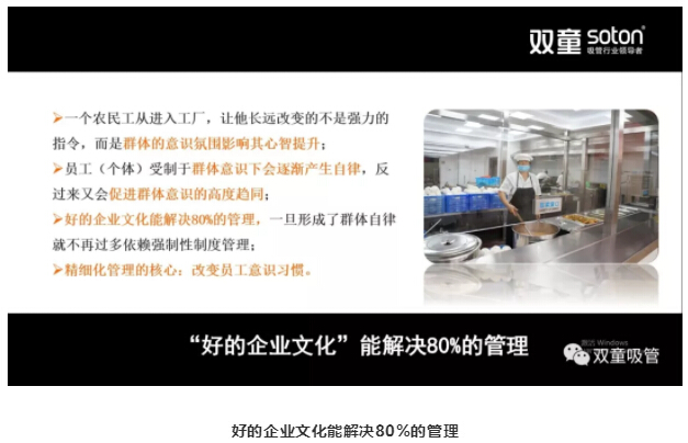 由此,我們認知到:質(zhì)量的改善僅有硬件和制度是不夠的,更需要不斷提升每一位員工的素養,形成高度統一的群體意識 。自此,“雙童”質(zhì)量文化開(kāi)始逐步完善,通過(guò)硬件環(huán)境和文化氛圍潛移默化地影響員工,用精細化管理的方式改變員工的意識和習慣。