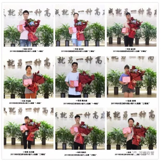 2019年8月口杯車(chē)間小組個(gè)人競賽一等獎:李自強、李會(huì )敏、魏文彪二等獎:李琴、王興麗、湯建杰、王艷麗、李賽男三等獎:王富霞、趙浩、王亞平、陶剛、劉李鵬、胡醫發(fā)、湯定國