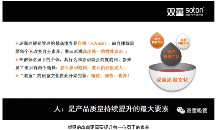 堅持或放棄僅一念之差,一秒鐘就可以放棄,但放棄了就沒(méi)有今天的“雙童“!最終,“雙童”選擇了持續“死磕”!這個(gè)過(guò)程中,“雙童”逐漸認知到,質(zhì)量管理體系建設,除了硬件之外,還需要制度化管理。