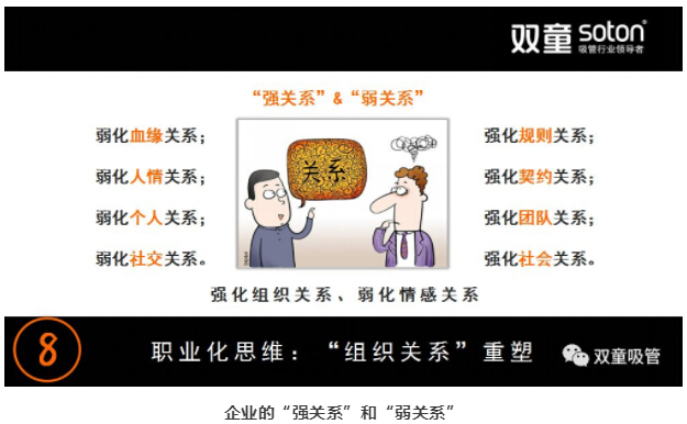 所以,企業(yè)要盡可能地弱化人情關(guān)系,善于利用規則和契約,通過(guò)規則去影響團隊,去解決經(jīng)營(yíng)過(guò)程中的問(wèn)題。在“雙童”,我們盡量減少人情上的關(guān)系,把工作以契約合同的形式加以固定,這樣也少了許多復雜的人情困擾!