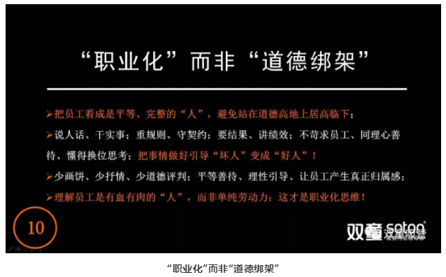 與此同時(shí),我們也要理解員工是有血有肉的“人”,而非單純的勞動(dòng)力,對待員工少“畫(huà)餅”,少抒情,懂得換位思考,不去“道德綁架”員工,讓員工真正產(chǎn)生歸屬感。