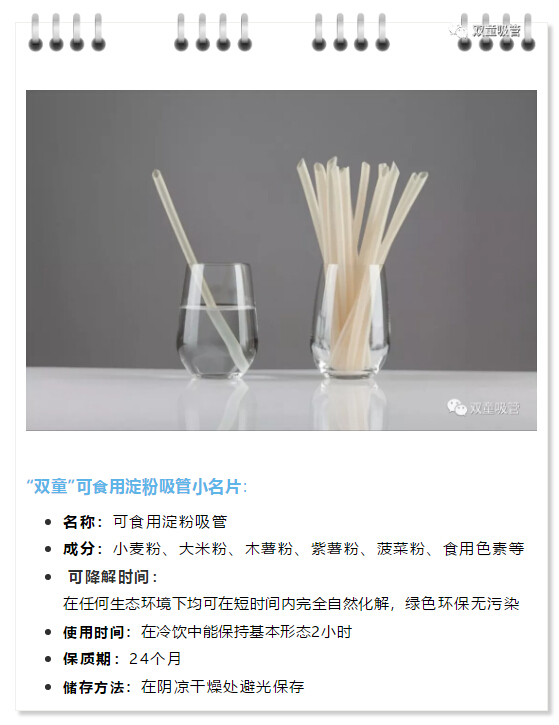 首先給大家介紹的是它的材質(zhì),“雙童”可食用淀粉吸管采用小麥、大米、玉米、木薯、土豆等天然農作物淀粉,經(jīng)高溫、高壓、熟化、擠出、烘干精制而成!