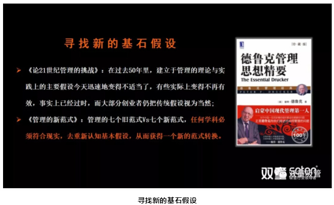 樓仲平引用德魯克思想中管理新范式的內容,引導大家更深入理解“范式轉換”:管理的新范式是指像管理學(xué)這一類(lèi)社會(huì )科學(xué)的關(guān)于"現實(shí)的基本假設"。任何學(xué)科必須符合現實(shí),去重新認知基本假設,從而獲得一個(gè)新的范式轉換。