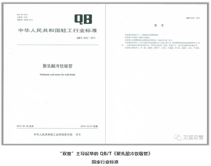 所以在2011年,“雙童”便上報國家標準化委員會(huì ),推動(dòng)編制起草了《聚乳酸冷飲吸管》國家行業(yè)標準,于2013年4月通過(guò)《聚乳酸冷飲吸管》行業(yè)標準的審核工作。在2014年,由“雙童”主導起草的 QB/T 4633-2014《聚乳酸冷飲吸管》國家行業(yè)標準正式發(fā)布并實(shí)施。本次標準的制訂將推動(dòng)環(huán)境友好型的生物質(zhì)可降解產(chǎn)品逐步替代傳統塑料吸管,并致力于消除塑料產(chǎn)品帶來(lái)的白色污染。