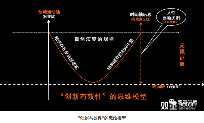 我用一個(gè)“創(chuàng )新思維模型”來(lái)呈現:組織作為萬(wàn)物當中的組成部分,在自然演變的過(guò)程當中組織存在度自然遞減。為了保證組織持續存在,就需要不斷地調整和干預,從而延緩組織自然墮變,保持組織活力!
