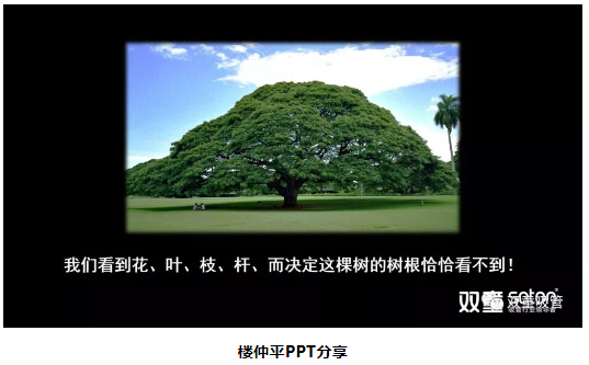 緊接著(zhù),樓仲平通過(guò)一棵樹(shù)的圖片,再次引導大家思考:我們通過(guò)圖片能看到樹(shù)的樹(shù)干、樹(shù)枝、樹(shù)葉等,但是真正決定這棵樹(shù)的樹(shù)根,卻并不能直接看到。所以,看不到的東西并不代表它不存在,反而往往是事物的根基和底層邏輯!