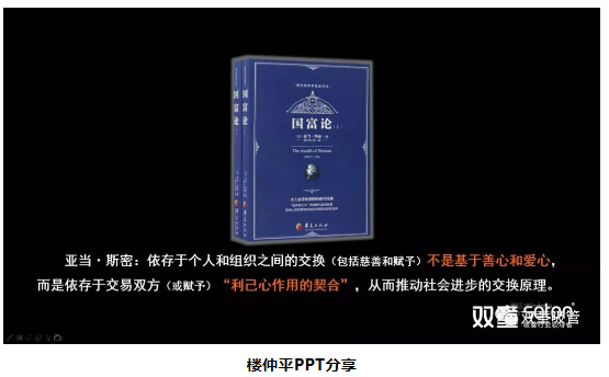 當晚,樓仲平將二十年前閱讀,并一直影響他至今的書(shū)籍《國富論》(此書(shū)被譽(yù)為“西方經(jīng)濟學(xué)圣經(jīng)”)也帶到了現場(chǎng),并直白地告訴大家,正是因為以亞當斯密的《國富論》為代表的西方哲學(xué)思想影響,他才能夠理解商業(yè)的底層邏輯,才能夠從另一個(gè)維度來(lái)認知:“雙童”的所作所為,并不是基于善心和愛(ài)心,而是基于商業(yè)交換原則下“利己心作用的契合”!
