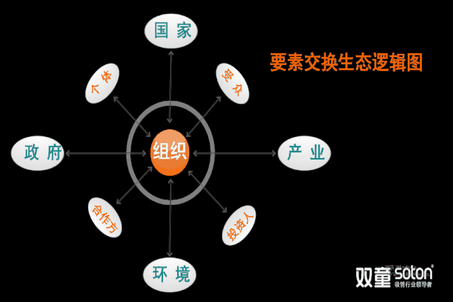 講到這里,樓仲平為了讓現場(chǎng)觀(guān)眾更好地理解,便展示了一副要素交換生態(tài)邏輯圖,清晰地向大家說(shuō)明:組織在發(fā)展過(guò)程中,與環(huán)境、產(chǎn)業(yè)、政府、國家等宏觀(guān)社會(huì )產(chǎn)生了鏈接,這種鏈接實(shí)際上是各種要素的相互交換和賦予。在合情、合理、合法、合乎道義的交換過(guò)程中,本質(zhì)上雙方出于“利己”的目的,但同時(shí)又給對方創(chuàng )造了價(jià)值,讓雙方都有所獲得,從而最終實(shí)現了“利他”。