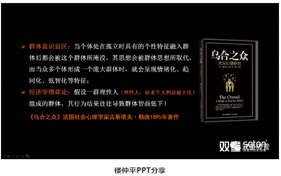 講到這里,樓仲平又向大家推薦了法國社會(huì )心理學(xué)家勒龐的著(zhù)作《烏合之眾》,該書(shū)中提到了群體意識盲區:當個(gè)體處在孤立時(shí)具有的個(gè)性特征融入群體后都會(huì )被這個(gè)群體所淹沒(méi),其思想會(huì )被群體思想所取代,而當眾多個(gè)體形成一個(gè)龐大群體時(shí),就會(huì )呈現情緒化、趨同化、低智化等特征。