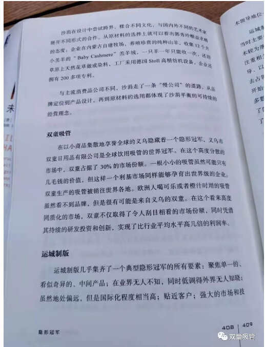 中國企業(yè)千千萬(wàn),說(shuō)到“隱形冠軍”也有不少,可為何此次《中外管理》雜志特別邀請了樓仲平一同前往采訪(fǎng)西蒙教授呢?原來(lái),早在2018年的首屆“中國造·隱形冠軍”評選活動(dòng)中,“雙童”就經(jīng)過(guò)陳春花教授等七位評委專(zhuān)家的評選,從24家優(yōu)秀企業(yè)中脫穎而出,被推選為首批“中國造·隱形冠軍”。除此之外,在西蒙教授最新所著(zhù)的《隱形冠軍》一書(shū)中,“雙童”也作為隱形冠軍企業(yè)案例被收錄其中!所以,此次的采訪(fǎng)“隱形冠軍之父”西蒙教授之行,“雙童”樓仲平作為中國隱形冠軍企業(yè)代表參與其中,也是再合適不過(guò)了!