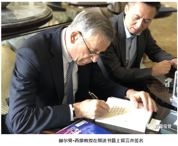 除此之外,西蒙教授還贈送了“雙童”樓仲平一本他親筆簽名的《隱形冠軍》書(shū)籍作為紀念!