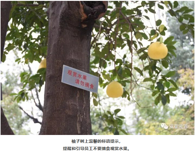 原來(lái),為了“雙童”的生態(tài)和美觀(guān),公司明確柚子是觀(guān)賞性水果,每棵柚子樹(shù)上都有“觀(guān)賞水果,請勿摘食”的字樣,提醒和引導員工不要摘食觀(guān)賞水果。