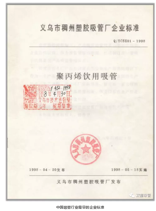 建設工廠(chǎng)缺少資金,樓仲平不僅把全部積蓄投進(jìn)去,還關(guān)掉了義烏市場(chǎng)一直在盈利的攤位;沒(méi)有行業(yè)標準,只有小學(xué)文化的他,自己埋頭鉆研制定指標、量化參數。1997年10月,由“雙童”起草的Q/YCSX01《聚丙烯飲用吸管》企業(yè)標準審核通過(guò),成為吸管行業(yè)最早的產(chǎn)品標準。
