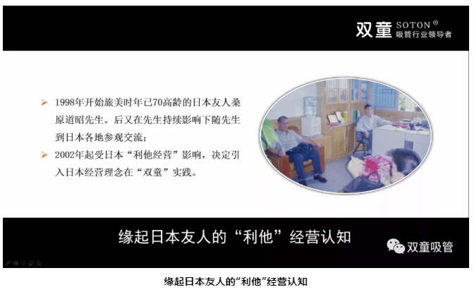 1998年,雙童樓仲平結識了一位旅美日本友人桑原道昭先生。桑原道昭先生在美國待了45年,會(huì )一點(diǎn)漢語(yǔ)。他會(huì )和樓仲平交流做生意的看法,并用日本人的視角和思想解讀節能環(huán)保、節約土地、員工關(guān)懷等方面的話(huà)題。