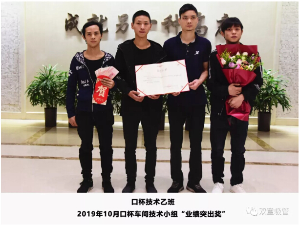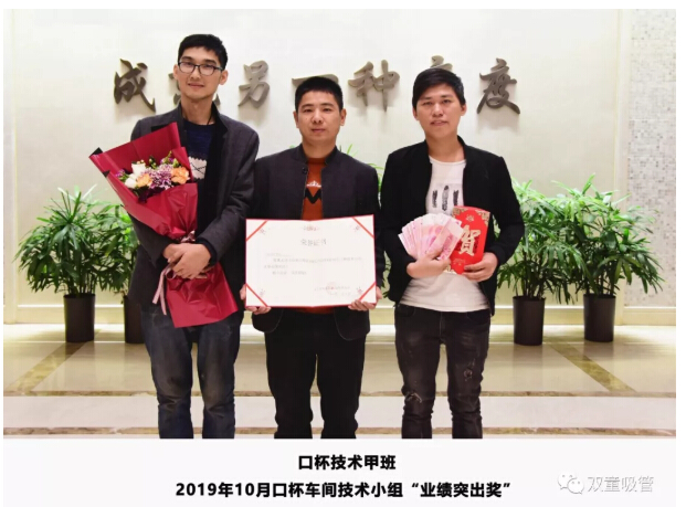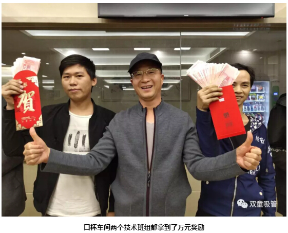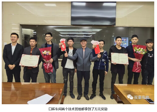 11月8日,在“雙童”隆重召開(kāi)的10月份優(yōu)秀奮斗者表彰大會(huì )上,口杯車(chē)間的兩個(gè)技術(shù)班組獲得了萬(wàn)元獎勵,成為公司生產(chǎn)班組的標桿!