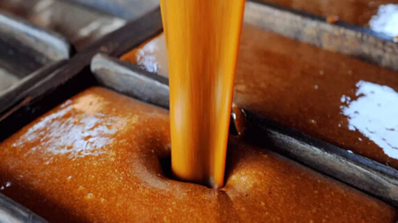 首先,把絞出的糖水放入第一口最大的鍋中燒煮,然后一步步讓水分慢慢蒸發(fā)干凈,當糖水蒸發(fā)到一定時(shí)候,煎熬的糖水變成了金黃色,在鍋中冒著(zhù)濃稠而滾圓的泡泡,幾個(gè)熬糖師傅用長(cháng)柄鐵勺不停地攪動(dòng)糖鍋,防止稠糖焦鍋底。