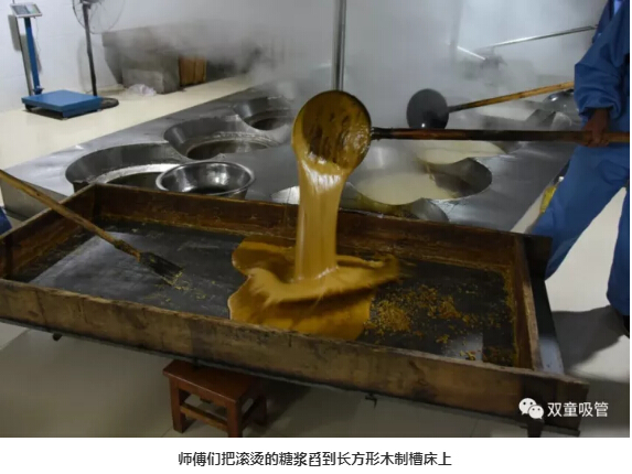 等到將全部濃稠的糖漿起到最末端的一口鍋中,看看差不多了,就將滾燙的糖漿,舀到一個(gè)長(cháng)方形的木制槽床上,制作成精細的紅糖,這些紅糖可以加工成麻花等紅糖產(chǎn)品。