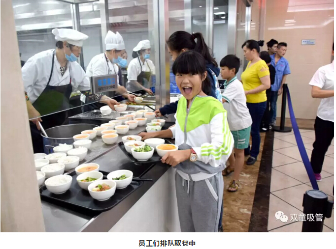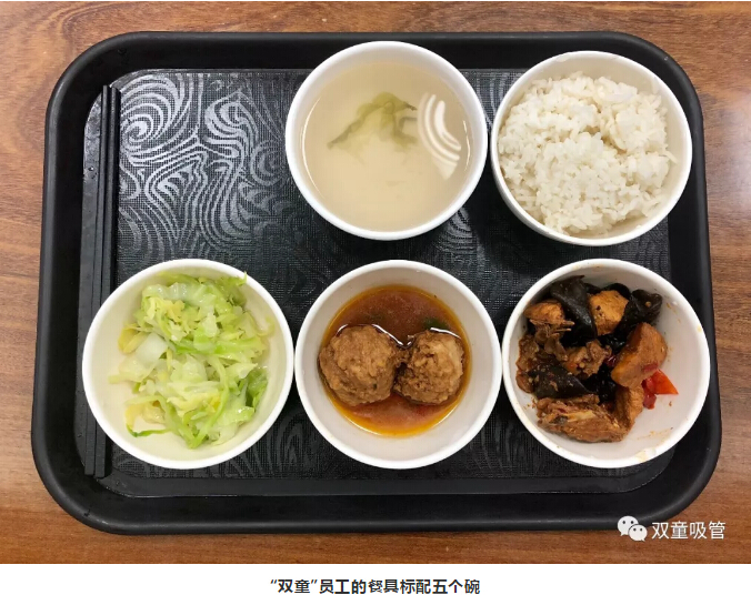 每天中午11點(diǎn),是“雙童”員工午餐時(shí)間。員工餐廳布局并不顯眼,但環(huán)境整潔、員工用餐井然有序。每位員工取過(guò)一個(gè)托盤(pán),從窗口依次拿好五個(gè)碗,包含三菜一湯一飯。