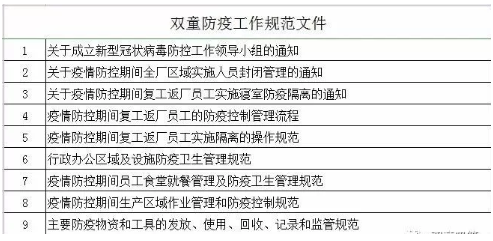 緊接著(zhù),“雙童”起草出臺了一系列有關(guān)防疫工作的流程規范文件,擬定了各項企業(yè)疫情防控流程,從而形成所有返廠(chǎng)員工的行為準則,做好復工前的防疫工作部署!