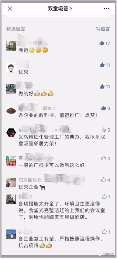 此篇文章發(fā)布后不僅引發(fā)了社會(huì )極大關(guān)注,很多企業(yè)也紛紛聯(lián)系吸管妞想借鑒“雙童”的復工文件進(jìn)行參考?;诟鞔笃髽I(yè)的需求,“雙童”復工防疫流程文件包將對企業(yè)進(jìn)行免費分享!快添加吸管妞微信免費領(lǐng)取吧!