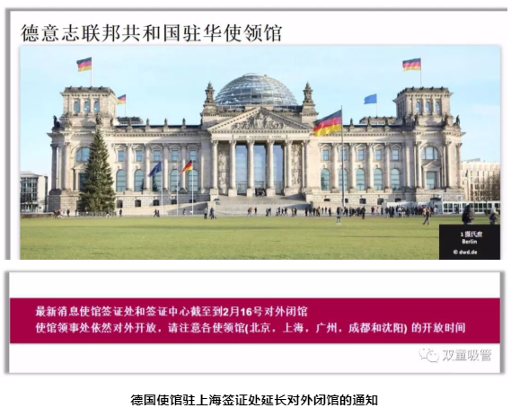 因春節期間突如其來(lái)的肺炎疫情影響,各國簽證中心都暫停了辦理簽證業(yè)務(wù)并拒絕中國公民入境。1月23日,上海簽證中心通知德國使館駐上海簽證處通知簽證中心截止至2月16日對外閉館,“雙童”的簽證被扣置。