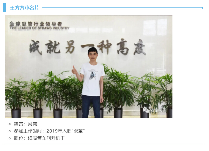 紙吸管車(chē)間開(kāi)機工王方方就是其中一員,他在“雙童”工作的短短一年內,連續四次在小組競賽中斬獲第一,并獲得了“2019年度十佳員工”稱(chēng)號!為何他能屢次獲得榮譽(yù)?他身上又有哪些閃光點(diǎn)?一起來(lái)看看吧!