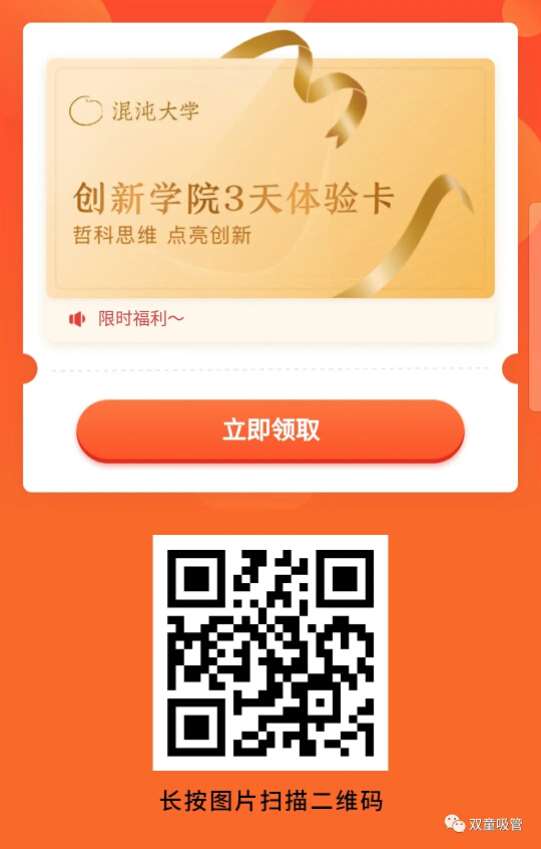 如果你還沒(méi)有聽(tīng)說(shuō)過(guò)混沌,如果你還持觀(guān)望態(tài)度,沒(méi)關(guān)系,我們?yōu)榇蠹覡幦〉搅嘶煦绱髮W(xué)最核心項目——創(chuàng )新學(xué)院的三天免費體驗卡,只要你掃碼下圖,即可享受為期3天的創(chuàng )新學(xué)院學(xué)籍!