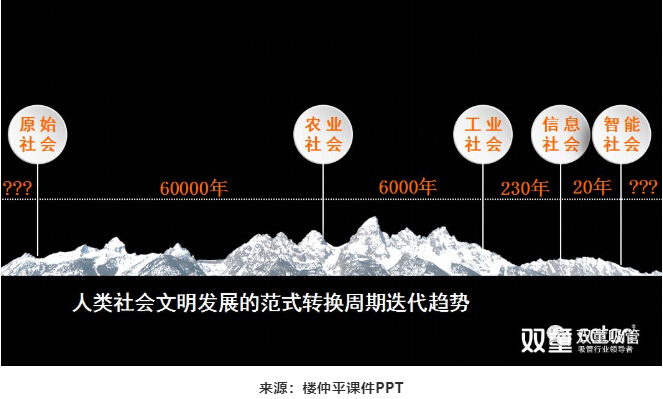 從這頁(yè)PPT中,我們可以看到,人類(lèi)從原始社會(huì )過(guò)渡到農業(yè)社會(huì ),經(jīng)歷了60000年;從農業(yè)社會(huì )過(guò)渡到工業(yè)社會(huì ),經(jīng)歷了6000年;從工業(yè)社會(huì )過(guò)渡到信息社會(huì ),經(jīng)歷了230年;而從信息社會(huì )過(guò)渡到智能社會(huì ),人類(lèi)僅僅需要20年。這說(shuō)明在人類(lèi)社會(huì )文明發(fā)展的過(guò)程中,范式轉換的周期變得越來(lái)越短。