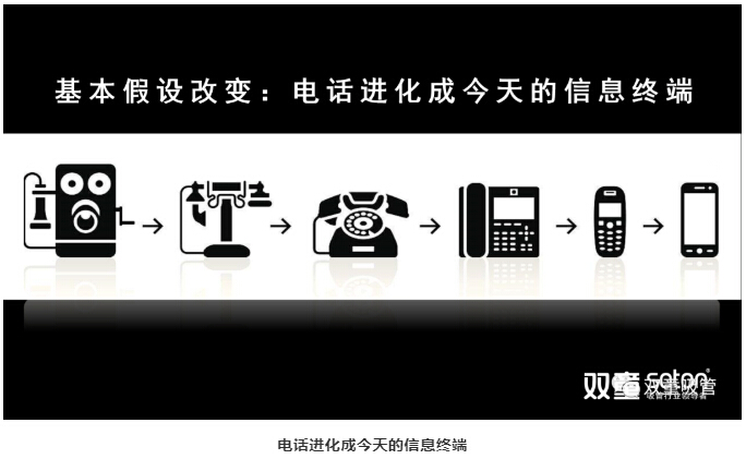 從最初語(yǔ)音傳播的工具到互聯(lián)網(wǎng)信息的主要傳播工具,電話(huà)的演變過(guò)程不正是工業(yè)化范式向互聯(lián)網(wǎng)范式的轉換嗎?如果你還認為電話(huà)僅僅是用來(lái)語(yǔ)音傳播的,那它一定會(huì )成為你的絆腳石。