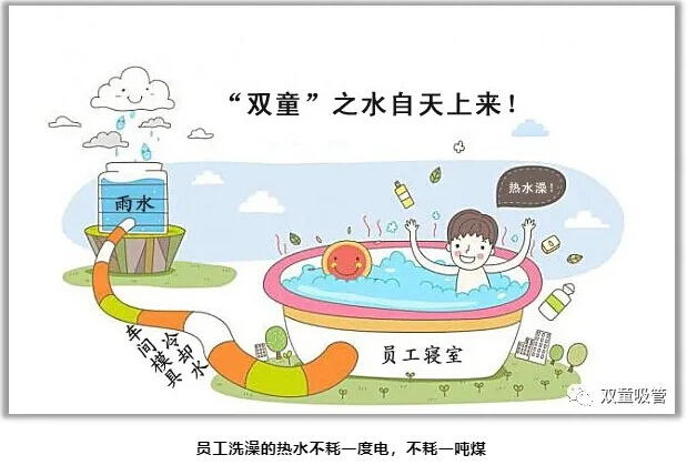最神奇的是,“雙童”員工洗澡的熱水不耗一度電,不耗一噸煤,全部是收集好的雨水經(jīng)車(chē)間模具冷卻后形成的余熱水哦!