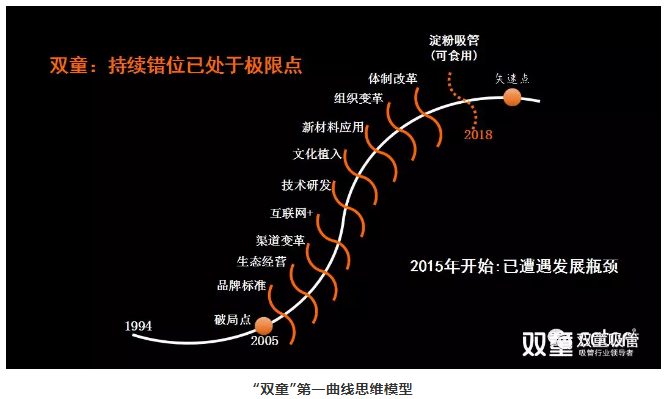 上述思維模型是“雙童”從1994年起步,但在2005年遭遇了發(fā)展瓶頸,雖然通過(guò)后續各個(gè)時(shí)期的錯位競爭,不斷創(chuàng )新一步步堅持到現在,但在2018年,“雙童”已達到持續錯位的極限點(diǎn)狀態(tài),已經(jīng)遇到天花板。