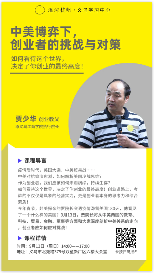 9月13日(周日)14:00~17:00,“創(chuàng )業(yè)教父”賈少華將在混沌大學(xué)義烏學(xué)習中心,從中美兩國的教育、科技、貿易、金融、軍事等方面和大家深度剖析中美關(guān)系的走向,創(chuàng )業(yè)者應如何應對挑戰!