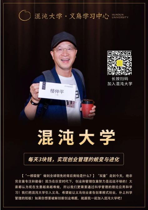 今年八月,樓仲平將“混沌大學(xué)”引進(jìn)義烏,就是想把上百堂讓他自己和“雙童”持續受益、不斷有新的進(jìn)步的課程,分享給每一位愛(ài)學(xué)習有夢(mèng)想,想在新時(shí)代里勇立潮頭的創(chuàng )業(yè)者們!