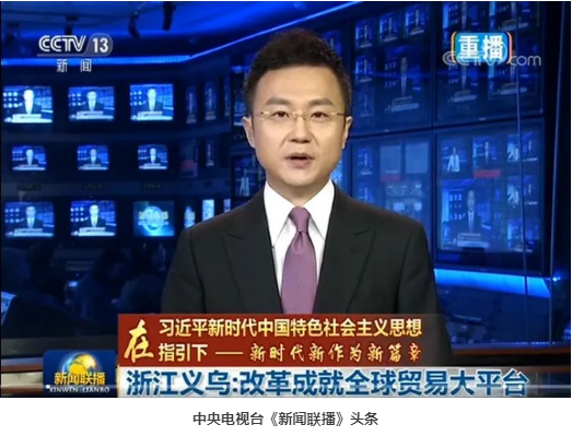 2019年12月7日,中央電視臺《新聞聯(lián)播》頭條以《【在習近平新時(shí)代中國特色社會(huì )主義思想指引下——新時(shí)代 新作為 新篇章】浙江義烏:改革成就全球貿易大平臺》為標題,聚焦義烏改革發(fā)展。被譽(yù)為世界小商品之都的浙江義烏,銳意改革,轉型突破,從一個(gè)靠著(zhù)紐扣、皮筋等不起眼的小物件起家的小商品市場(chǎng),成為我國國際貿易綜合改革豐碩成果的展示區。