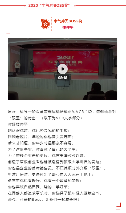 除了給優(yōu)秀奮斗者頒發(fā)了獎項之外,“雙童”全體員工還為我們的Boss——樓仲平準備了一個(gè)驚喜!到底是什么驚喜呢?戳視頻一起來(lái)看看: