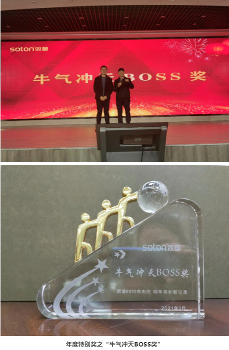 最后,總經(jīng)理李二橋現場(chǎng)為樓總頒發(fā)了“牛氣沖天BOSS獎”!愿公司在兩位Boss的帶領(lǐng)下,“雙童”在2021年度能夠能蒸蒸日上,越來(lái)越好!